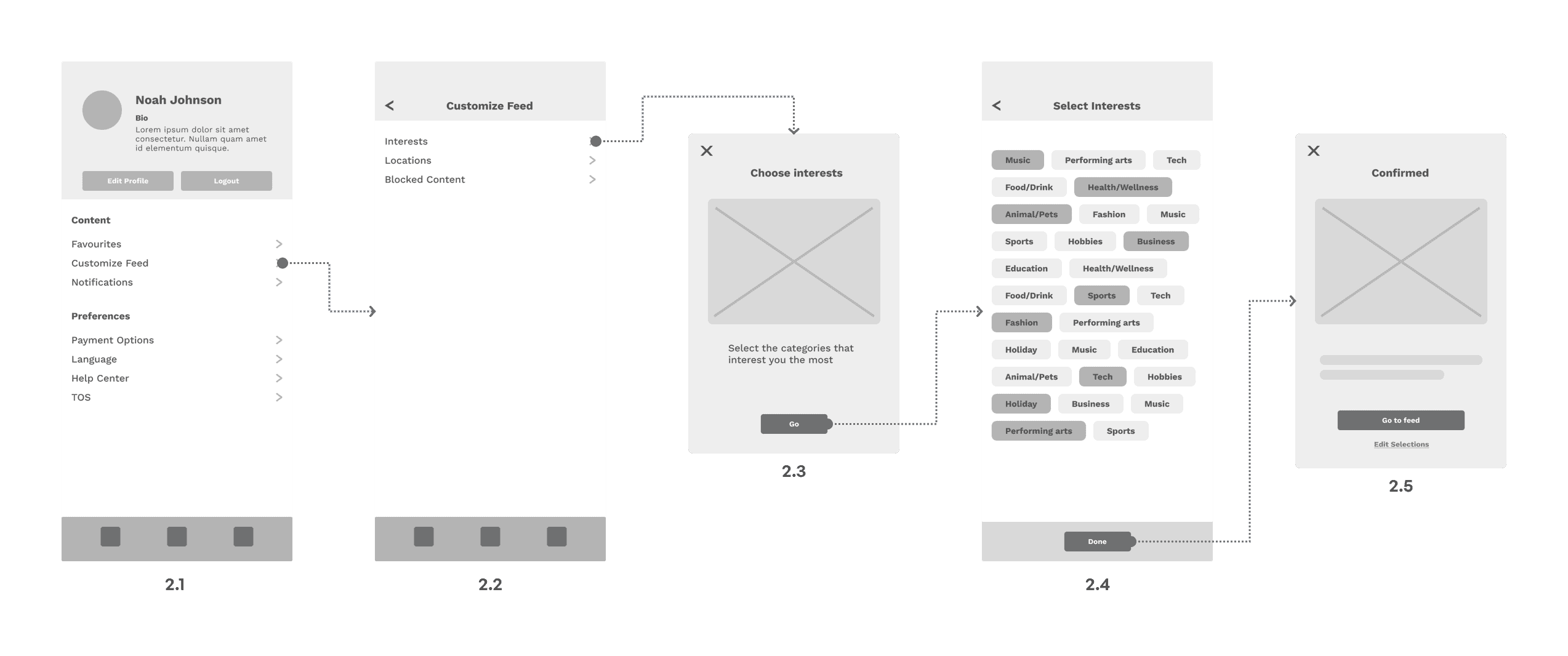 Users were confused with the initial stages of this task flow, between pages 2.1 - 2.3. Users didn't know which link they should click on to 'curate their feed' and admitted that some additional prompts would be helpful. This led to a complete overhaul of this flow, to be a more guided experience.